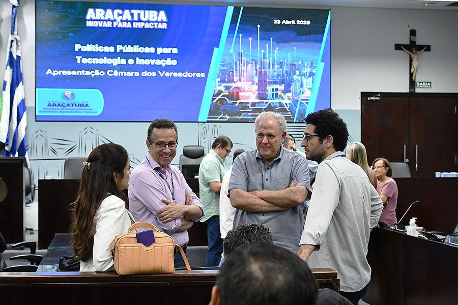 A presidente da Câmara, vereadora Edna Flor (Podemos), e os vereadores João Pedro Pugina (PL), Ícaro Morales (Cidadania), Hideto Honda (PSD) e Rodrigo Atayde (PRTB) acompanharam a apresentação, que destacou o potencial de Araçatuba para ser uma referência em tecnologia e inovação no interior paulista.