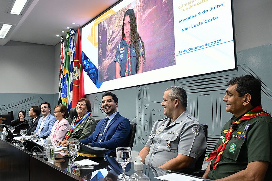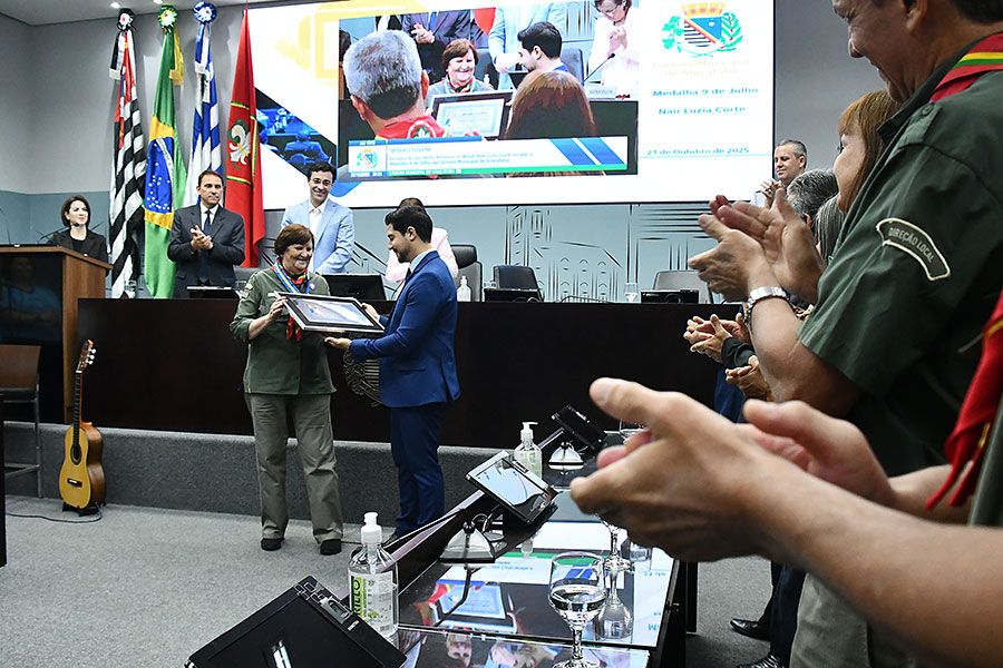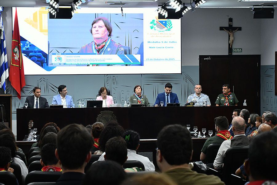 Em sessão solene realizada nesta quinta-feira (23/10), a Câmara de Araçatuba entregou a Medalha 9 de Julho para a senhora Nair Luzia Corte, secretária administrativa do Grupo Escoteiro Dom Bosco de Araçatuba.