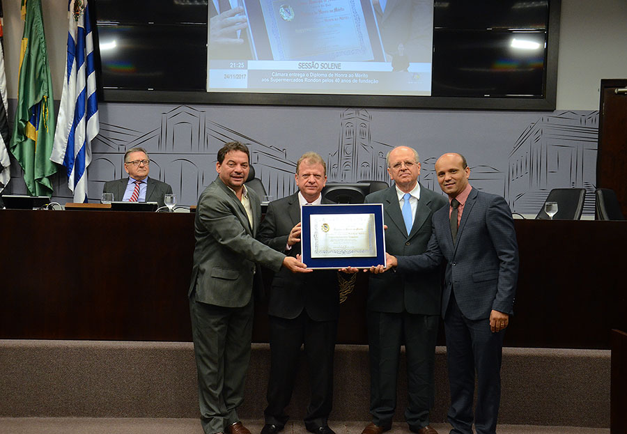 O Legislativo de Araçatuba entregou, nesta sexta-feira (24/11), o Diploma de Honra ao Mérito aos Supermercados Rondon em reconhecimento aos 40 anos de fundação e aos relevantes serviços prestados ao município e região nas áreas empresarial e social.