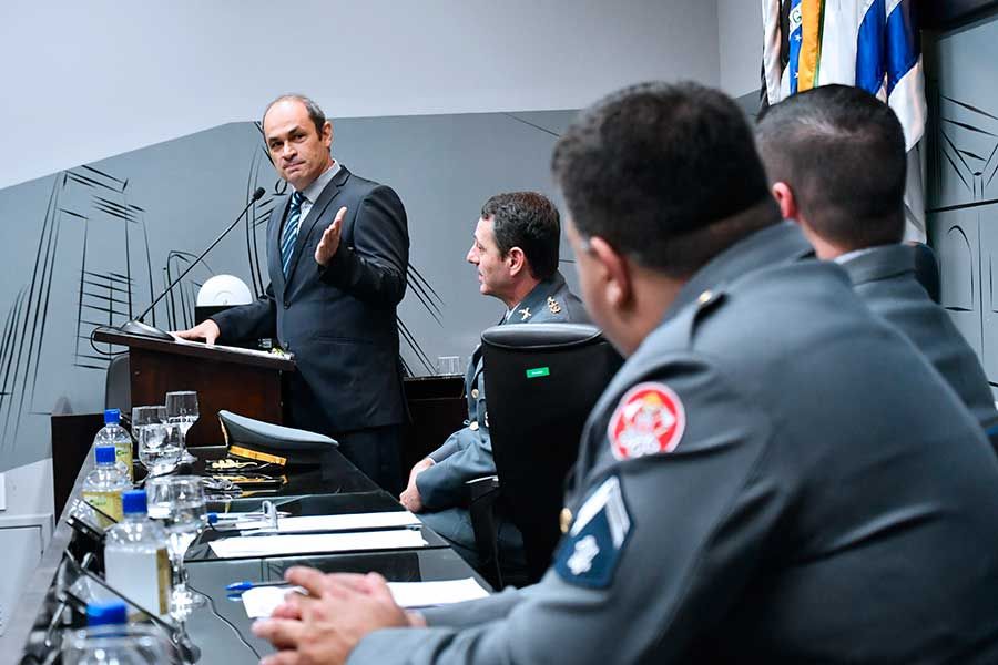 Representando o presidente da Câmara, vereador Dr. Alceu (PSDB), o vereador Arnaldinho (Cidadania) e o autor do projeto de decreto legislativo que propiciou a homenagem, vereador Nelsinho Bombeiro (PV), compuseram a mesa de honra da solenidade, ao lado do próprio homenageado da noite e de autoridades ligadas à administração municipal e ao comando da Polícia Militar.