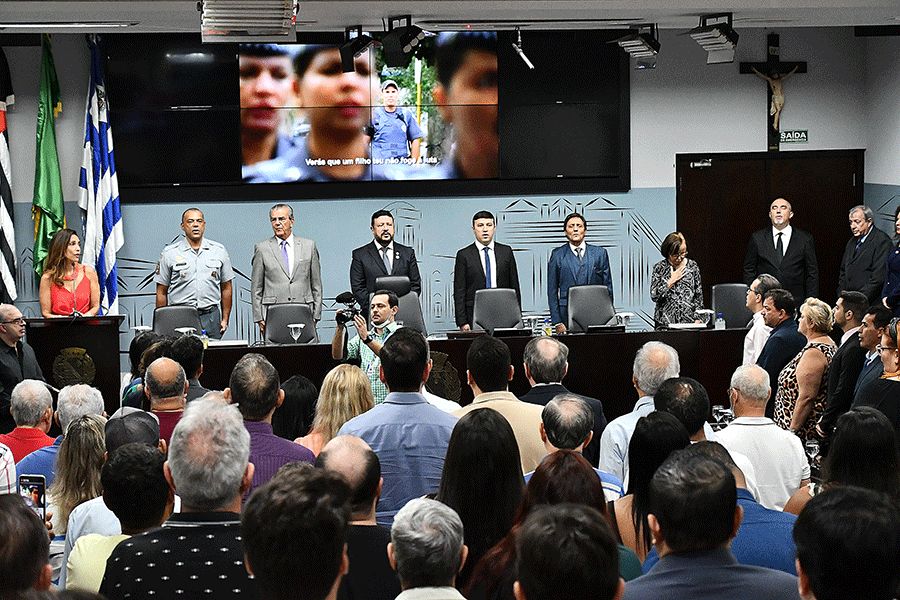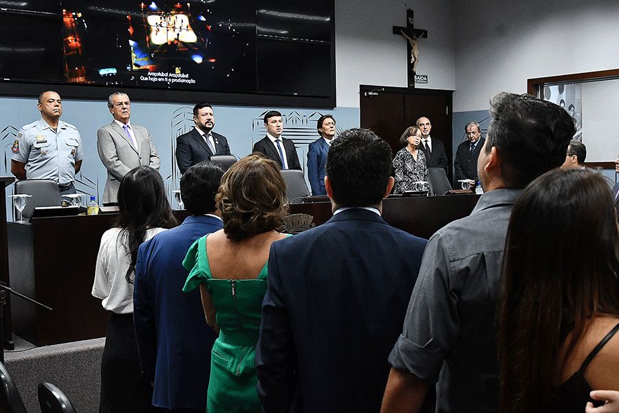 No lugar de destaque da mesa, Guga assistiu a um filme produzido pelas equipes de cerimonial e de assessoria de comunicação da Câmara que descreveu a trajetória de infância, aprendizado, com destaque para a formação de ensino superior e carreira profissional, com destaque na Comunicação Social e nas Forças Armadas.