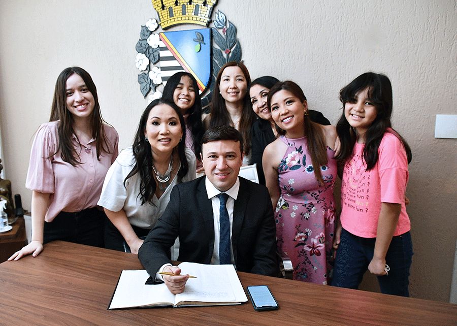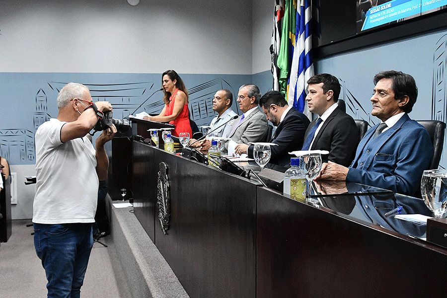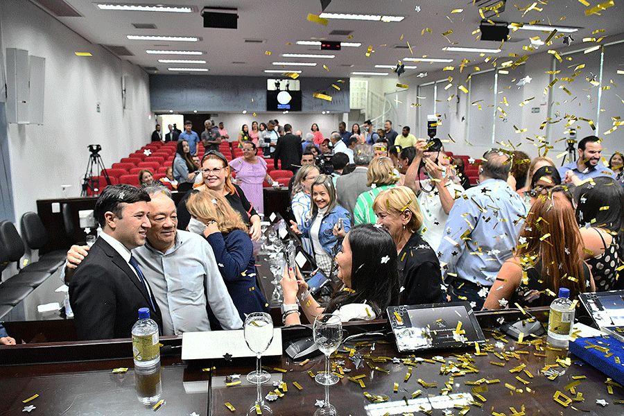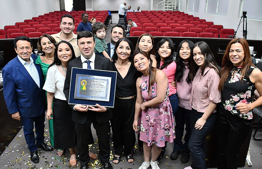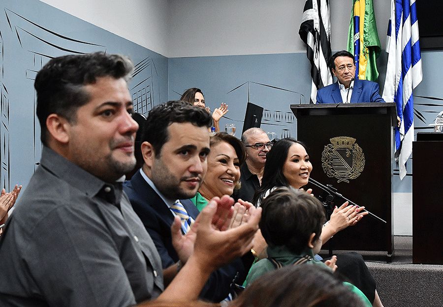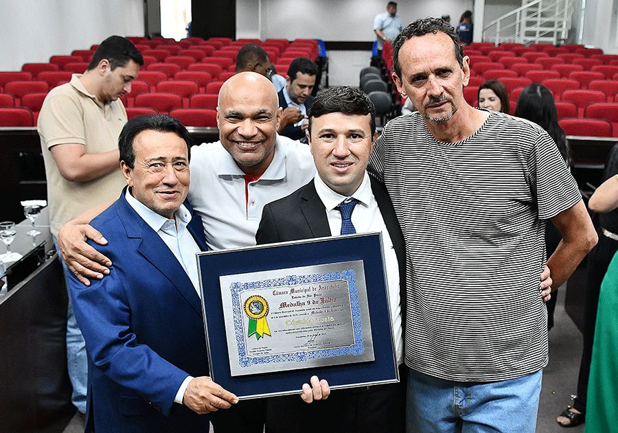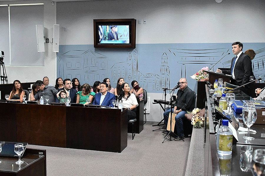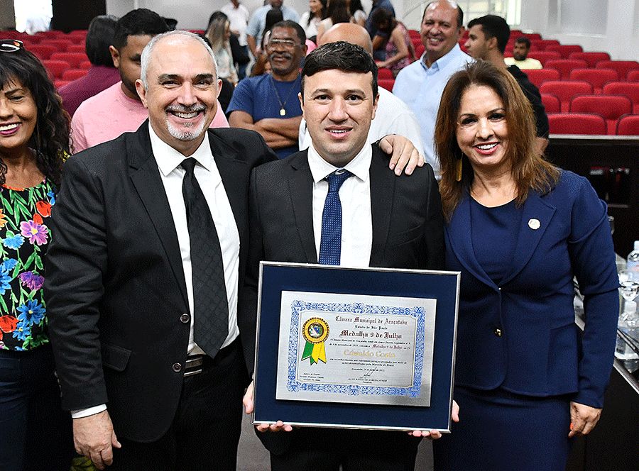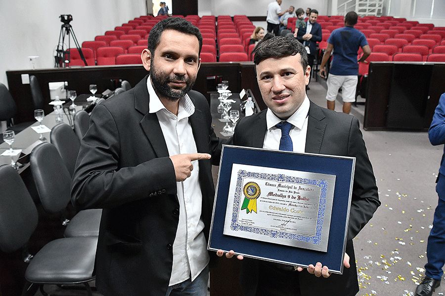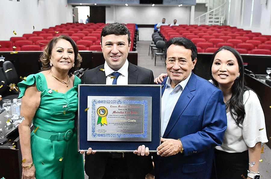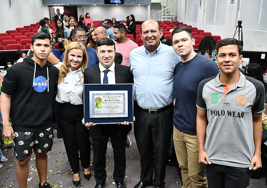 Guga Costa, como é mais conhecido pelos familiares e pela rede de amigos, compôs a mesa de honra da solenidade, ao lado do prefeito Dilador Boges (PSDB), da vice Edna Flor (Cidadania), do vereador Dr. Jaime (PSDB) – coautor do projeto de decreto legislativo que concede a homenagem – e do presidente da Câmara, vereador Dr. Alceu (PSDB).