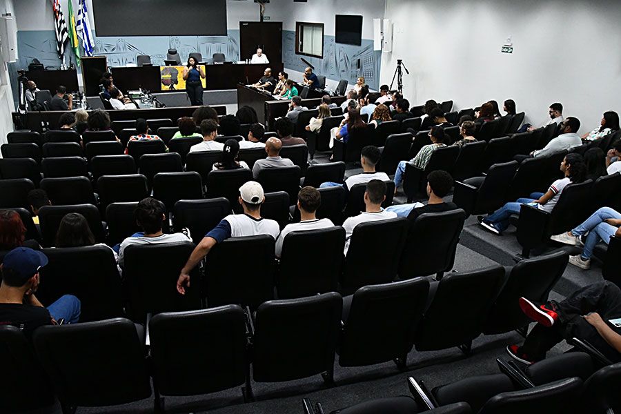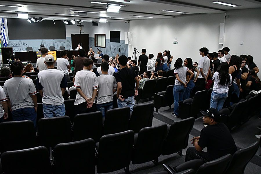 Nas galerias, alunos do ensino médio da Escola Vitor Antônio Trindade acompanharam as apresentações de cada integrante da mesa.