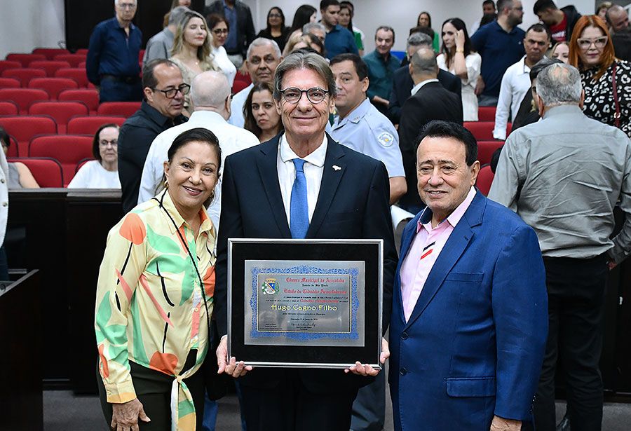 Após receber a honraria, o homenageado usou a tribuna para agradecer. “Agradeço a todos que aprovaram a honraria. É uma imensa honra receber essa homenagem em Araçatuba”, destacou Hugo Cagno Filho.
