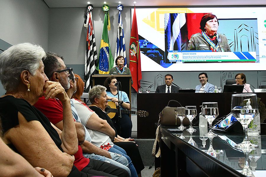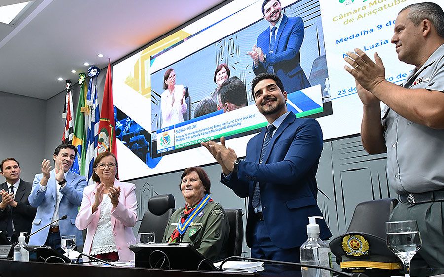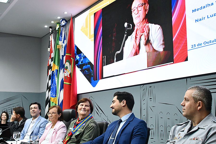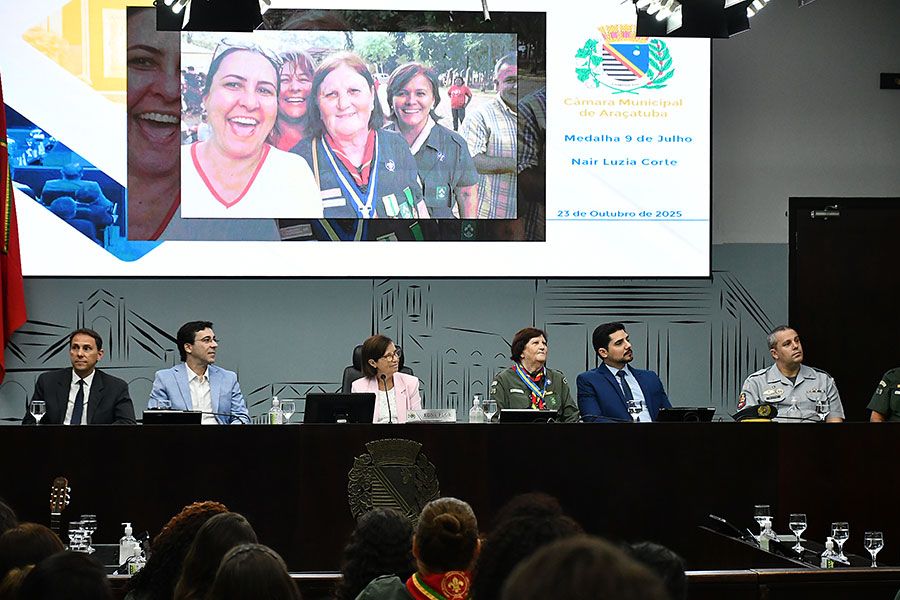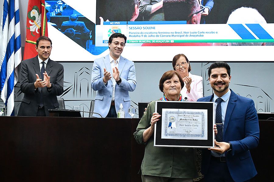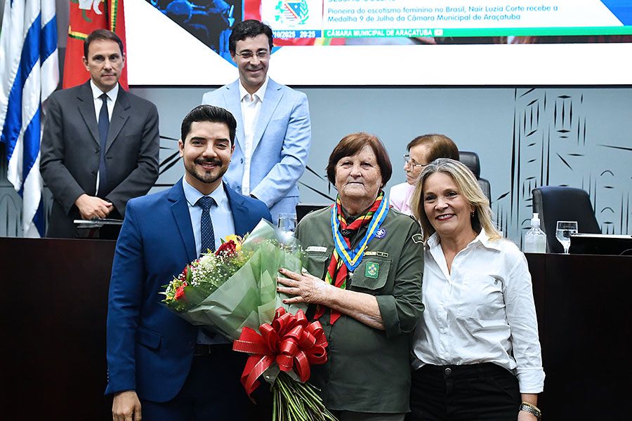 Em sessão solene realizada nesta quinta-feira (23/10), a Câmara de Araçatuba entregou a Medalha 9 de Julho para a senhora Nair Luzia Corte, secretária administrativa do Grupo Escoteiro Dom Bosco de Araçatuba.