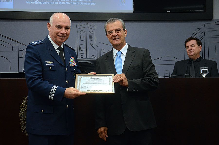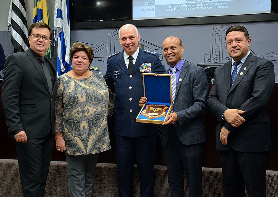 O Major-Brigadeiro-do-Ar Marcelo Kanitz Damasceno recebeu, na noite desta quinta-feira (11/10), o Título de Cidadão Araçatubense. A honraria, proposta pelo vereador Dr. Almir (PSDB), visa reconhecer os relevantes serviços prestados pelo homenageado ao município.