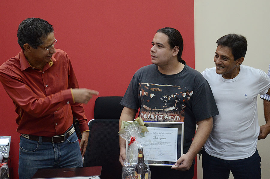 O vereador Dr Jaime (PTB) entregou, junto o prefeito Cido Sério (PT), um voto de Aplauso para o estudante, de 19 anos, Bruce Wellington Amorim da Silva, no gabinete da prefeitura, na manhã de sexta-feira (12/06). O homengeado parte ainda este mês para estudar no exterior, através do Programa Ciência sem Fronteiras, do governo federal. Ele é aluno de Tecnologia em Biocombustíveis da Faculdade de Tecnologia do Estado de São Paulo, a Fatec de Araçatuba, e foi no curso que soube da possibilidade de expandir seus conhecimentos em outro país.
