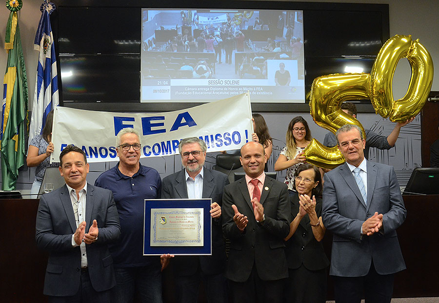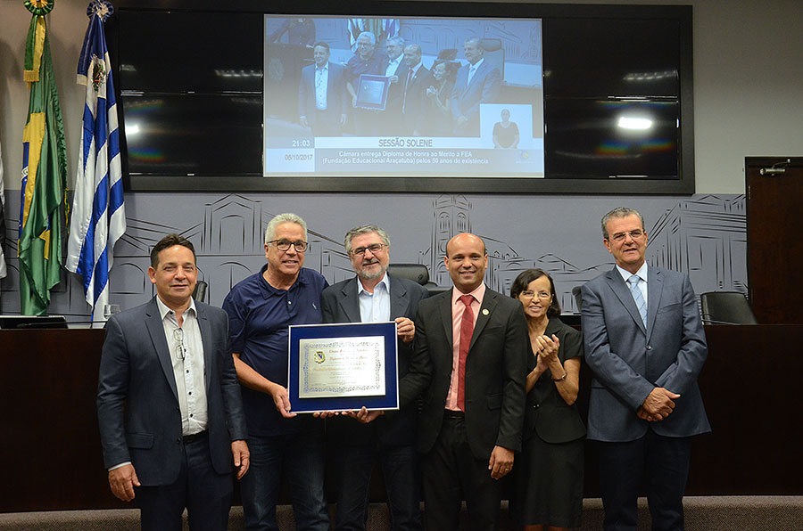 Com a presença de integrantes do Conselho de Curadores, de diretores, professores e alunos da Fundação Educacional Araçatuba, a Câmara de Araçatuba fez a entrega, em sessão solene nesta sexta-feira (6/10), do Diploma de Honra ao Mérito à instituição que completou 50 anos de existência no município.